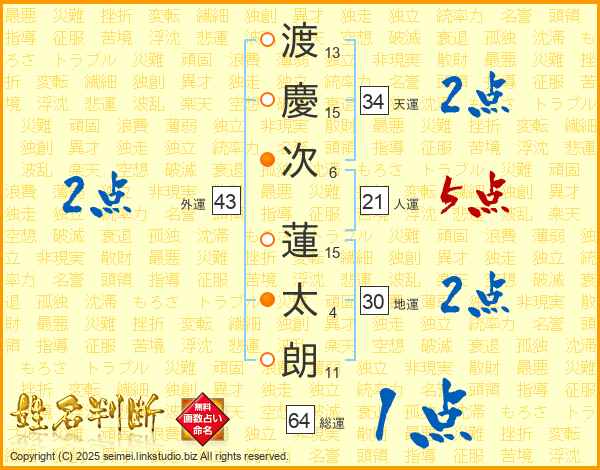 渡(13画)慶(15画)次(6画) 蓮(15画)太(4画)朗(11画)