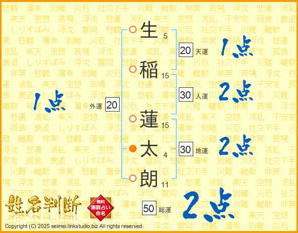 生(5画)稲(15画) 蓮(15画)太(4画)朗(11画)