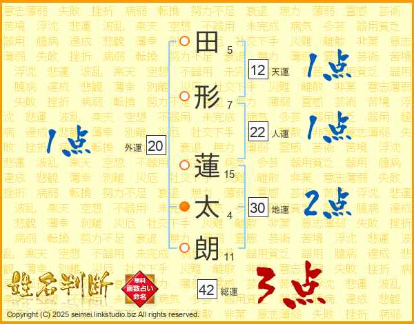 田(5画)形(7画) 蓮(15画)太(4画)朗(11画)