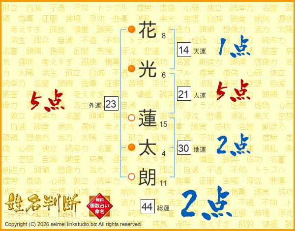 花(8画)光(6画) 蓮(15画)太(4画)朗(11画)