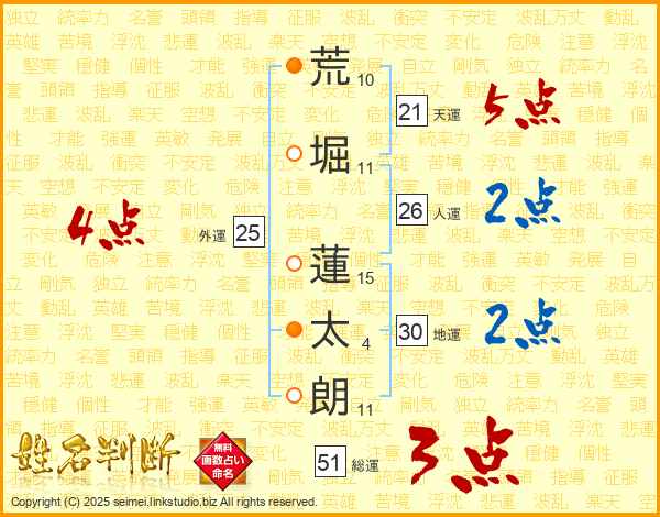 荒(10画)堀(11画) 蓮(15画)太(4画)朗(11画)