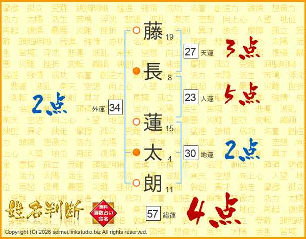 藤(19画)長(8画) 蓮(15画)太(4画)朗(11画)