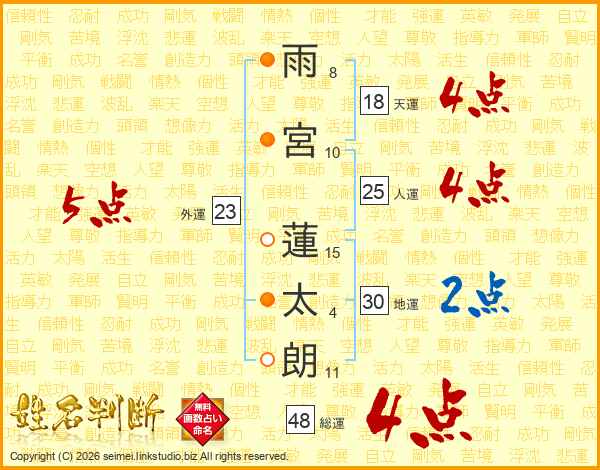 雨(8画)宮(10画) 蓮(15画)太(4画)朗(11画)