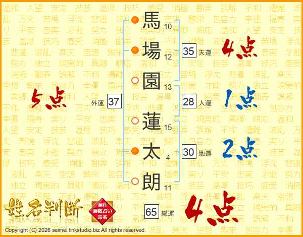 馬(10画)場(12画)園(13画) 蓮(15画)太(4画)朗(11画)
