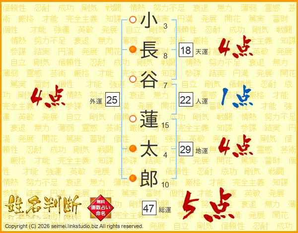 小(3画)長(8画)谷(7画) 蓮(15画)太(4画)郎(10画)