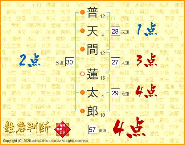 普(12画)天(4画)間(12画) 蓮(15画)太(4画)郎(10画)