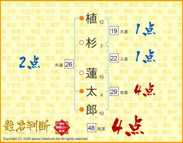 植(12画)杉(7画) 蓮(15画)太(4画)郎(10画)
