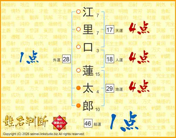 江(7画)里(7画)口(3画) 蓮(15画)太(4画)郎(10画)