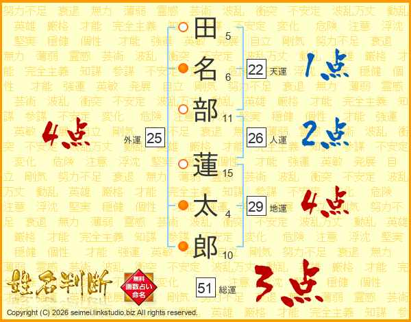 田(5画)名(6画)部(11画) 蓮(15画)太(4画)郎(10画)