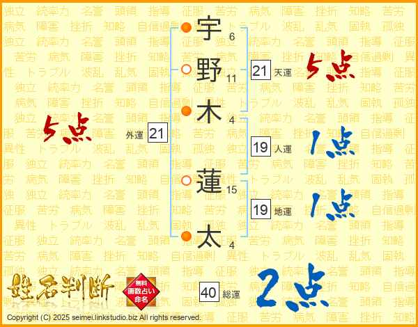 宇(6画)野(11画)木(4画) 蓮(15画)太(4画)