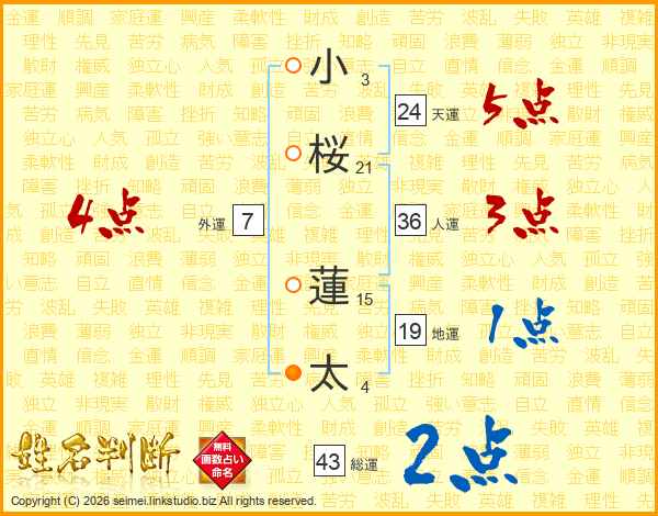 小(3画)桜(21画) 蓮(15画)太(4画)
