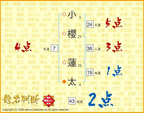 小(3画)櫻(21画) 蓮(15画)太(4画)