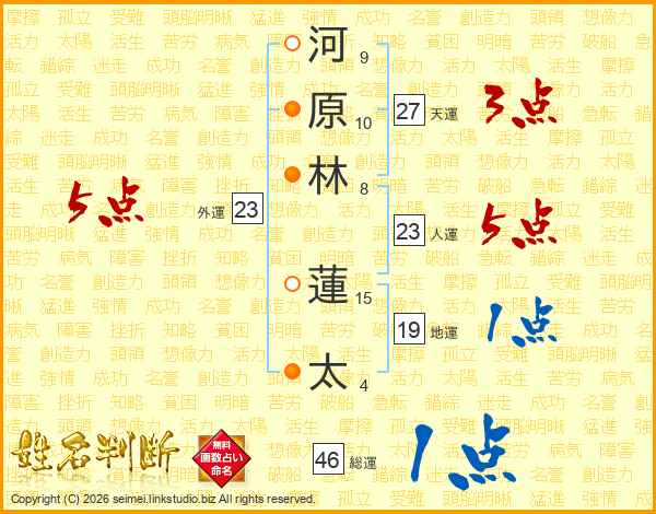 河(9画)原(10画)林(8画) 蓮(15画)太(4画)