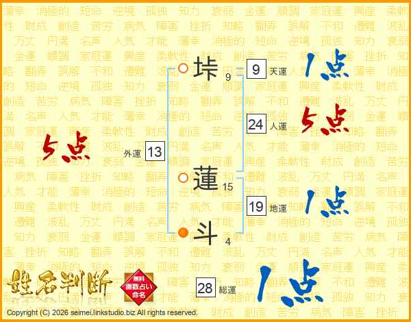 生活面を象徴する運勢です。外部から受ける影響力を表し、結婚運、家庭運や職場、環境への順応性を表します。総運から人運を引いた画数。姓や名が1文字の場合を除く。