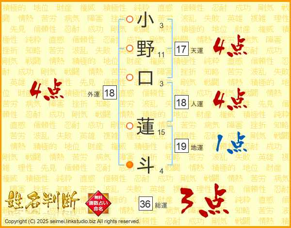 小(3画)野(11画)口(3画) 蓮(15画)斗(4画)
