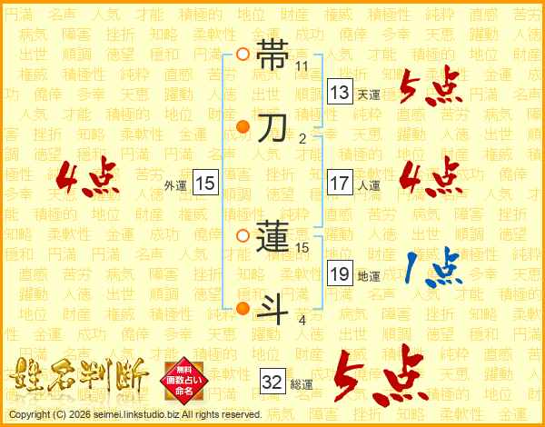 生活面を象徴する運勢です。外部から受ける影響力を表し、結婚運、家庭運や職場、環境への順応性を表します。総運から人運を引いた画数。姓や名が1文字の場合を除く。