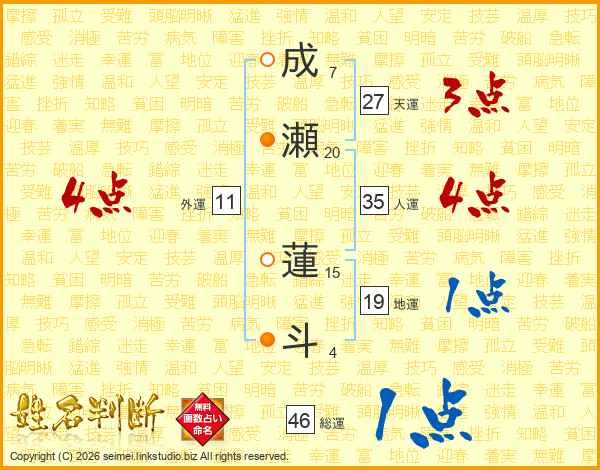 成(7画)瀬(20画) 蓮(15画)斗(4画)