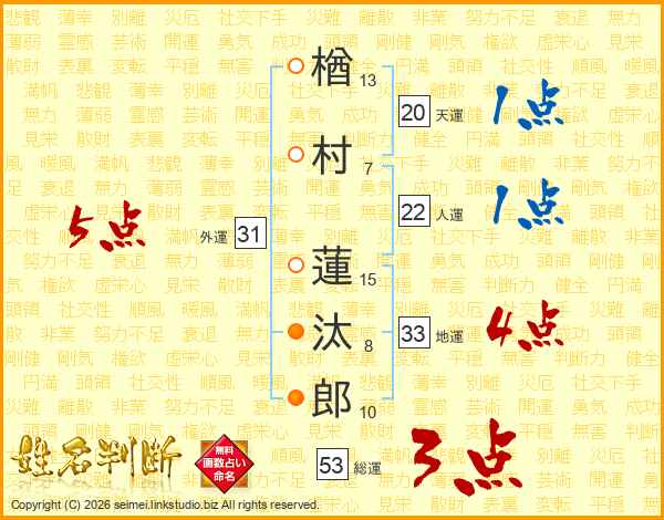 楢(13画)村(7画) 蓮(15画)汰(8画)郎(10画)