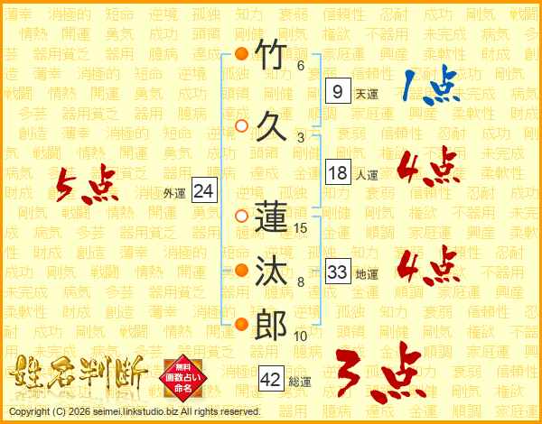竹(6画)久(3画) 蓮(15画)汰(8画)郎(10画)