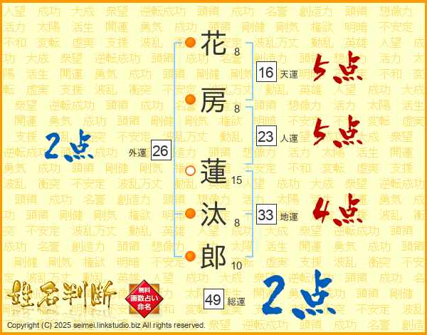 花(8画)房(8画) 蓮(15画)汰(8画)郎(10画)