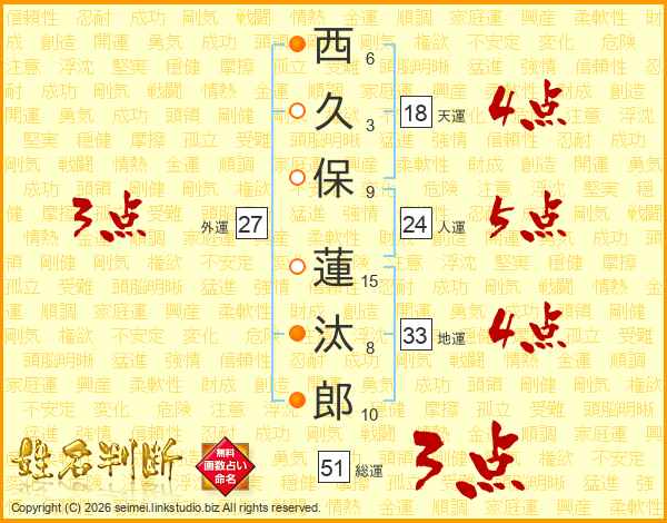 西(6画)久(3画)保(9画) 蓮(15画)汰(8画)郎(10画)