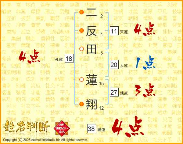 二(2画)反(4画)田(5画) 蓮(15画)翔(12画)
