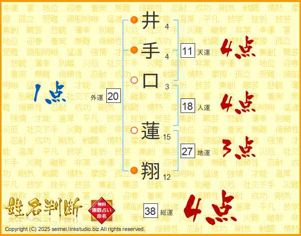 井(4画)手(4画)口(3画) 蓮(15画)翔(12画)