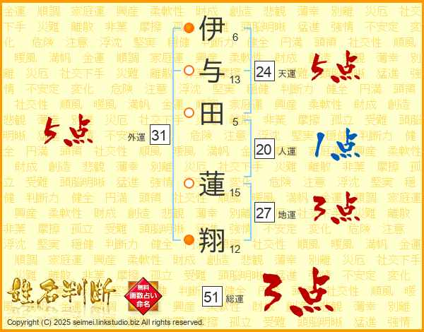 伊(6画)与(13画)田(5画) 蓮(15画)翔(12画)