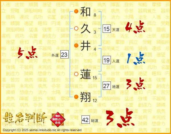 和(8画)久(3画)井(4画) 蓮(15画)翔(12画)