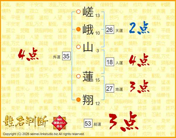 嵯(13画)峨(10画)山(3画) 蓮(15画)翔(12画)