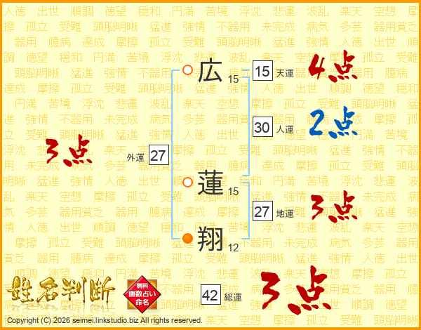 広(15画) 蓮(15画)翔(12画)