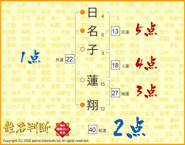日(4画)名(6画)子(3画) 蓮(15画)翔(12画)