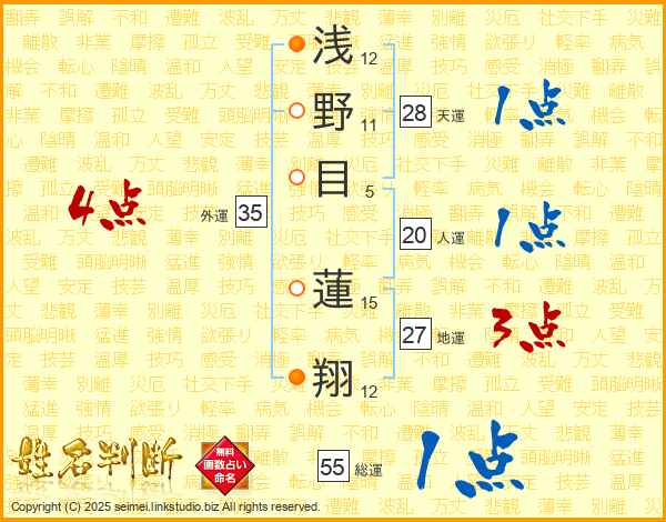 浅(12画)野(11画)目(5画) 蓮(15画)翔(12画)