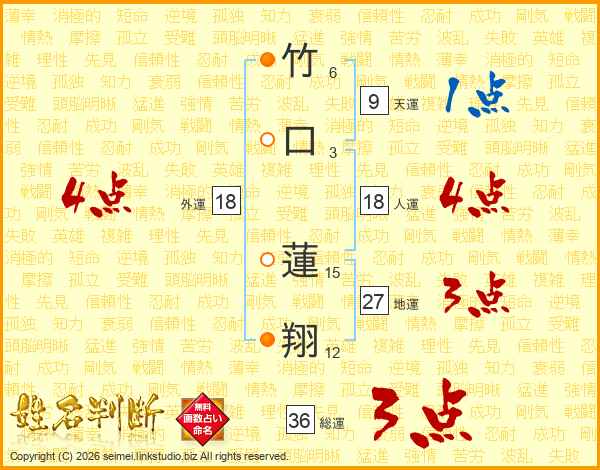 竹口蓮翔さんの総運は36画の3点!