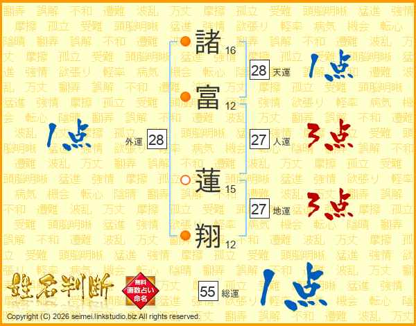 諸(16画)富(12画) 蓮(15画)翔(12画)