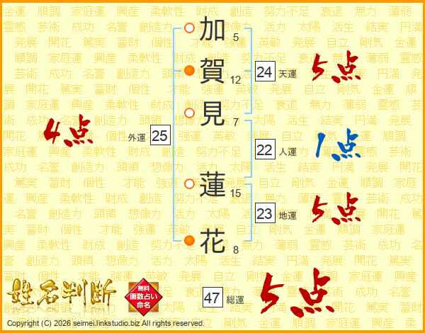加(5画)賀(12画)見(7画) 蓮(15画)花(8画)