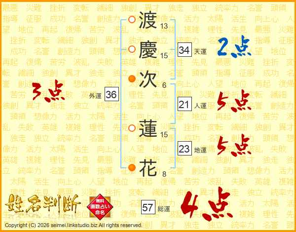 渡(13画)慶(15画)次(6画) 蓮(15画)花(8画)