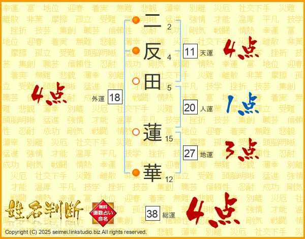 生活面を象徴する運勢です。外部から受ける影響力を表し、結婚運、家庭運や職場、環境への順応性を表します。総運から人運を引いた画数。姓や名が1文字の場合を除く。