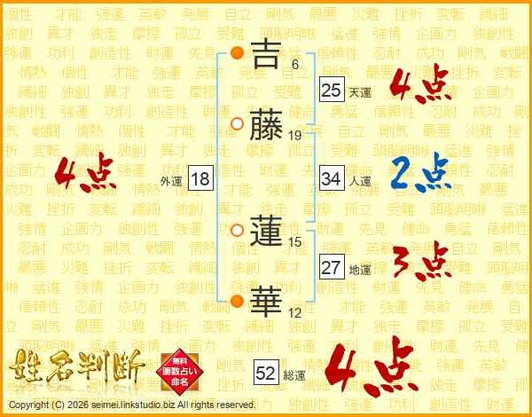 吉(6画)藤(19画) 蓮(15画)華(12画)