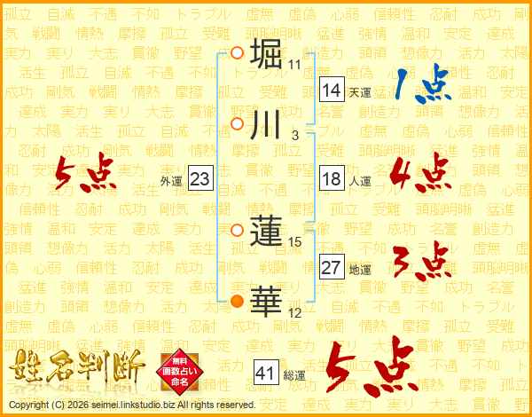 堀(11画)川(3画) 蓮(15画)華(12画)