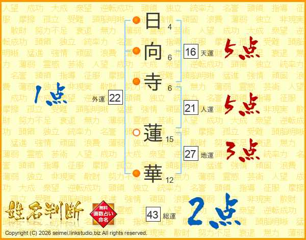 日(4画)向(6画)寺(6画) 蓮(15画)華(12画)