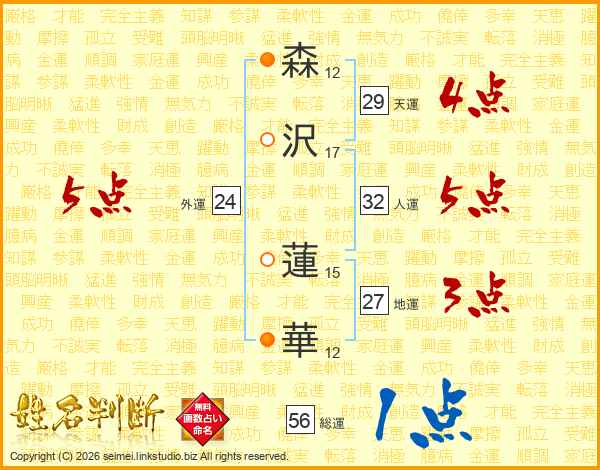 森(12画)沢(17画) 蓮(15画)華(12画)