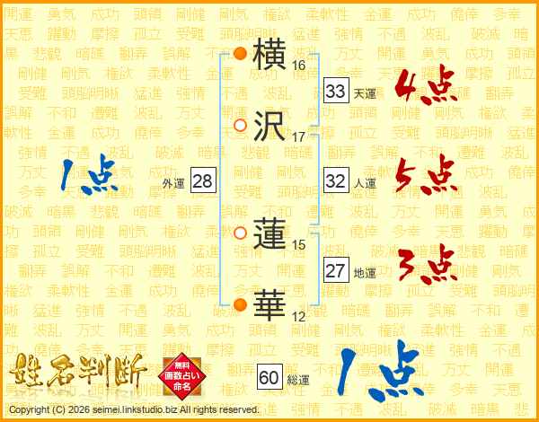 横(16画)沢(17画) 蓮(15画)華(12画)