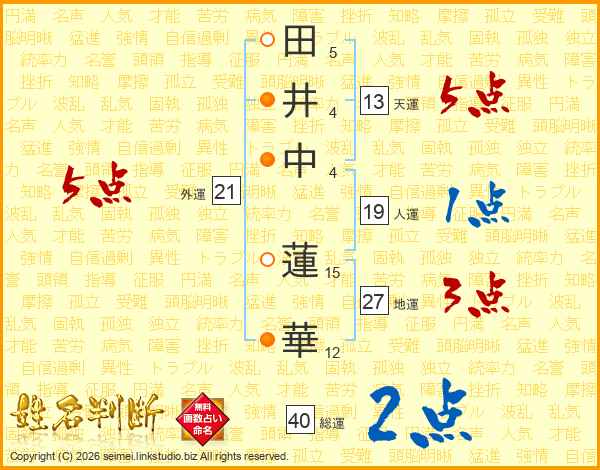 田(5画)井(4画)中(4画) 蓮(15画)華(12画)
