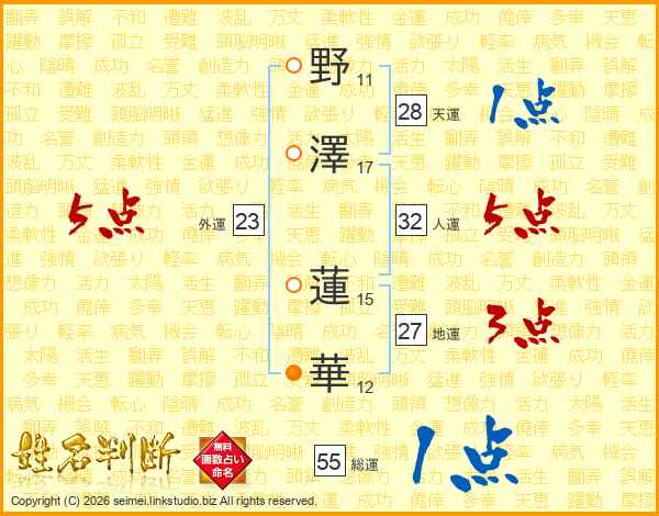野(11画)澤(17画) 蓮(15画)華(12画)