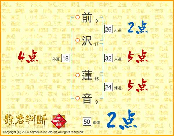 前(9画)沢(17画) 蓮(15画)音(9画)