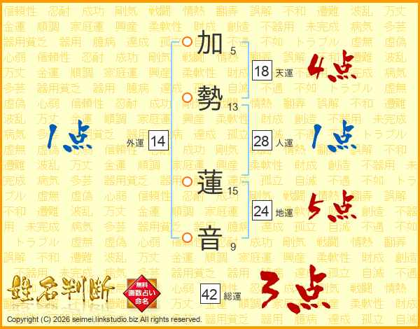 加勢蓮音さんの外運は14画の1点!