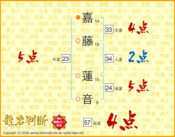 嘉藤蓮音さんの総運は57画の4点!