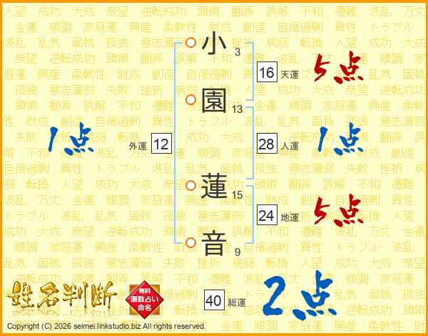 生活面を象徴する運勢です。外部から受ける影響力を表し、結婚運、家庭運や職場、環境への順応性を表します。総運から人運を引いた画数。姓や名が1文字の場合を除く。