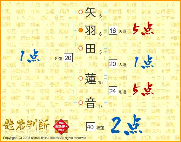 矢(5画)羽(6画)田(5画) 蓮(15画)音(9画)